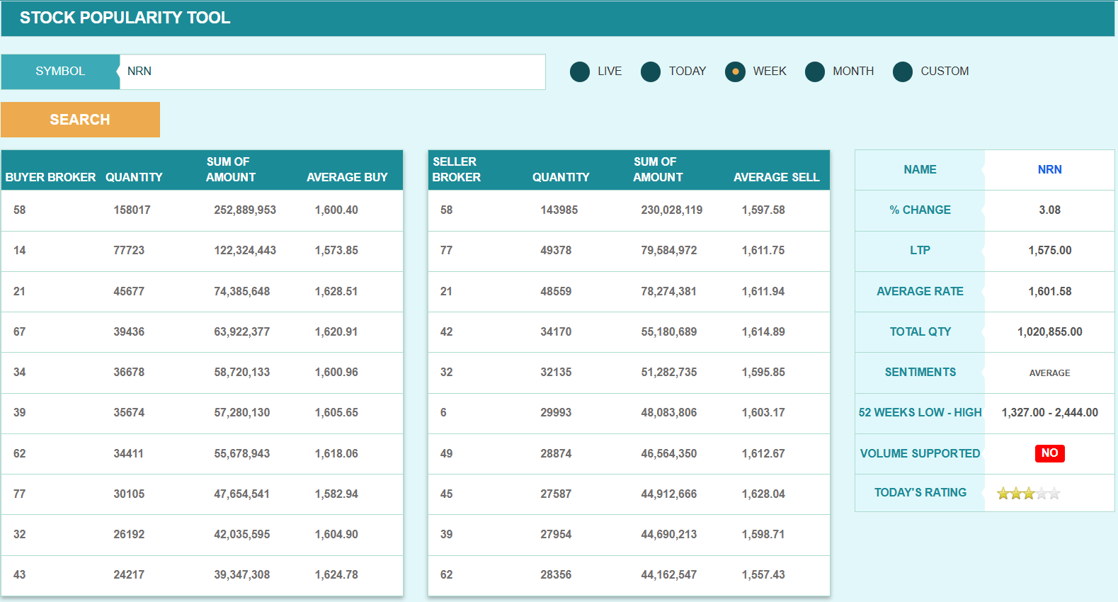 यस साता ब्रोकर नम्बर ५८ ले कम्पनीको सबैभन्दा बढी शेयर खरिद गरेको छ। सो ब्रोकरले यस साता कम्पनीको १ लाख ५८ हजार १७ कित्ता शेयर खरिद गरेको हो। त्यसैगरी, यस साता सोही ब्रोकरले कम्पनीको सबैभन्दा बढी शेयर बिक्री गरेको छ। सो ब्रोकरले यस साता कम्पनीको १ लाख ४३ हजार ९८५ कित्ता शेयर बिक्री गरेको छ।