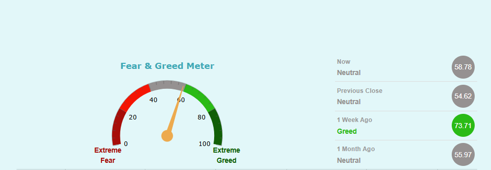 फियर एण्ड ग्रीड मिटरमा कम्पनीको शेयरमूल्य अहिले ग्रीड जोनबाट न्यूट्रल जोनमा झरेको छ। यसले लगानीकर्ताहरुमा कम्पनीको शेयरमूल्य बढ्छ भन्ने अपेक्षा घटेको संकेत गर्दछ।