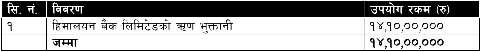कम्पनीले यस निष्काशनबाट प्राप्त हुने कुल १४ करोड १० लाख रुपैयाँ हिमालयन बैंकको ऋण भुक्तानी गर्न खर्च गर्नेछ।