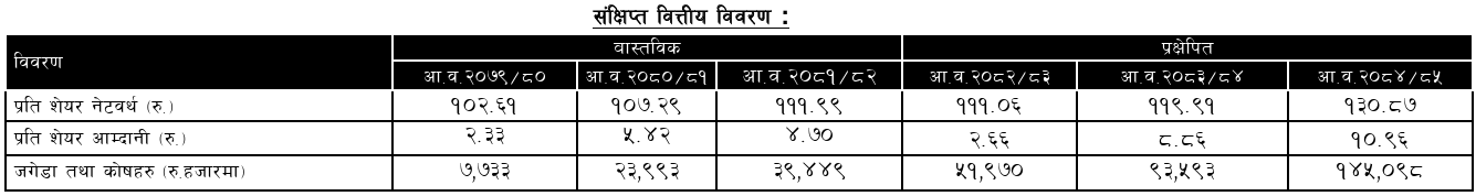 चालु आर्थिक वर्षको अन्त्यसम्ममा कम्पनीले जगेडा कोष ५ करोड १९ लाख ७० हजार रुपैयाँ पुग्ने प्रक्षेपण गरेको छ। सो अवधिसम्ममा कम्पनीको प्रतिशेयर आम्दानी २ रुपैयाँ ६६ पैसा र प्रतिशेयर नेटवर्थ १११ रुपैयाँ ६ पैसा पुग्ने प्रक्षेपण गरिएको छ।
