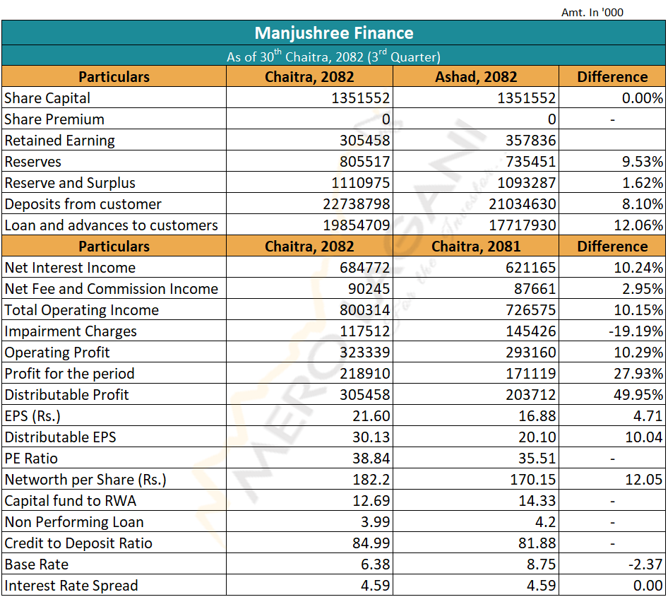 समीक्षा अवधिमा फाइनान्सको खुद ब्याज आम्दानी १०.२४ प्रतिशत बढेको छ भने खुद फि तथा कमिशन आम्दानी २.९५ प्रतिशत बढेको छ। त्यसैगरी, समीक्षा अवधिमा फाइनान्सको कुल सञ्चालन आम्दानी १०.१५ प्रतिशत र सञ्चालन मुनाफा १०.२९ प्रतिशत बढेको छ। फाइनान्सको इम्पेरमेन्ट चार्ज भने समीक्षा अवधिमा १४ करोड ५४ लाख रुपैयाँबाट घटेर ११ करोड ७५ लाख रुपैयाँमा सीमित भएको छ।
