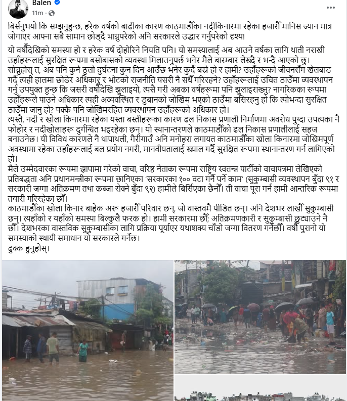 सरकारले सुकुम्वासी बस्ती हटाउने तयारी गरिरहँदा बालेनले शुक्रबार फेसबुकमा स्टाटस लेख्दै यस्तो उल्लेख गरेका हुन् । अब पनि कुन दिन ठूलो दुर्घटना हुन्छ भनेर कुरेर बस्न नहुने उनले उल्लेख गरेका छन् ।