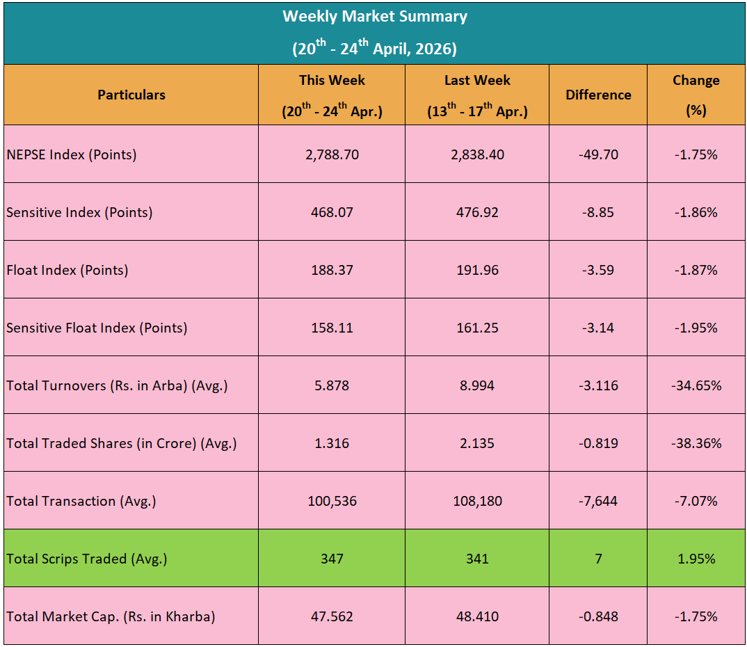 यस साता पाँच कारोबार दिनका लागि बजार खुलेको थियो। जसमध्ये चार कारोबार दिन नेप्से घटेको थियो भने १ कारोबार दिन बढेर बन्द भएको थियो।