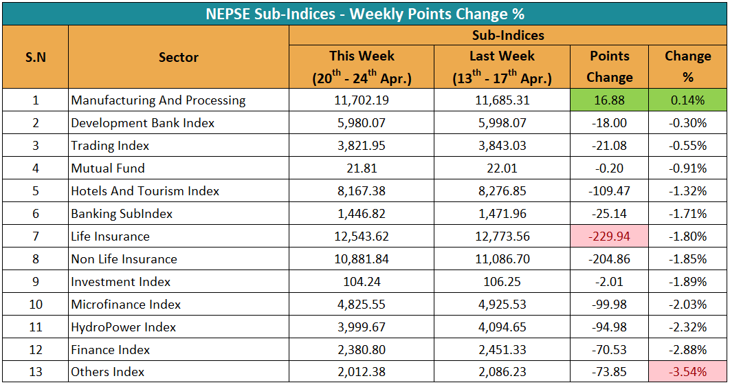 यस साता १३ उपसमूहमध्ये १ उपसमूहको परिसूचक बढेको छ भने १२ उपसमूहको परिसूचक घटेको छ। यस साता उत्पादन तथा प्रशोधन उपसमूहको परिसूचक ०.१४ प्रतिशत बढेको हो। गत साता ११ हजार ६८५.३१ विन्दुमा बन्द भएको यस उपसमूहको परिसूचक, यस साता १६.८८ अंक बढेर ११ हजार ७०२.१९ विन्दुमा पुगेको छ।
