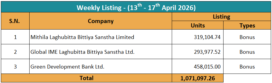 यस साता ३ कम्पनीको १० लाख ७१ हजार ९७.२६ कित्ता शेयर नेप्सेमा सूचीकृत भएको छ। यस साता मिथिला लघुवित्त वित्तीय संस्था, ग्लोबल आइएमई लघुवित्त वित्तीय संस्था र ग्रीन डेभलपमेन्ट बैंकको बोनस शेयर नेप्सेमा सूचीकृत भएको हो।