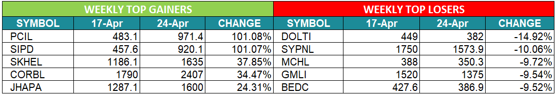 यस साता पाल्पा सिमेन्ट इण्डष्ट्रीजको शेयरमूल्य सर्वाधिक १०१.०८ प्रतिशत बढेको छ। गत साता ४८३ रुपैयाँ १० पैसामा अन्तिम कारोबार भएको सो कम्पनीको शेयर यस साता ९७१ रुपैयाँ ४० पैसामा अन्तिम कारोबार भएको छ। त्यस्तै, यस साता शिखर पावर डेभलपमेन्टको शेयरमूल्य पनि १०१ प्रतिशतभन्दा बढी बढेको छ भने सूर्यकुण्ड हाइड्रो इलेक्ट्रिकको शेयरमूल्य ३७.८५ प्रतिशत बढेको छ। यस साता दोल्ती पावर कम्पनीको शेयरमूल्य सर्वाधिक १४.९२ प्रतिशत घटेको छ भने एसवाई प्यानल नेपालको शेयरमूल्य १० प्रतिशतभन्दा बढी घटेको छ।