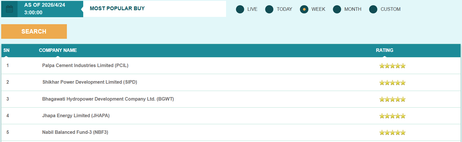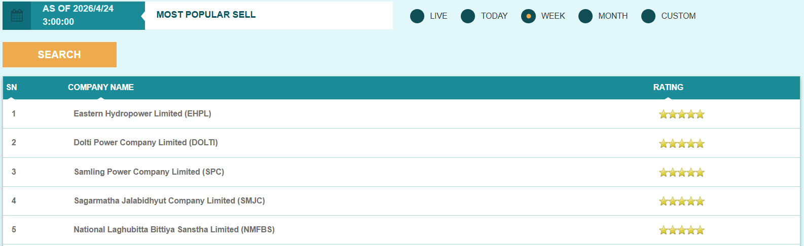 फ्लोरसिट विश्लेषण गर्दा यस साता पाल्पा सिमेन्ट इण्डष्ट्रीज, शिखर पावर डेभलपमेन्ट, भगवती हाइड्रोपावर डेभलपमेन्ट कम्पनी लगायतका स्टकहरु मोस्ट पपुलर बाइ स्टक सूचीको शीर्ष स्थानमा रहेका छन् भने इष्टर्न हाइड्रोपावर, दोल्ती पावर कम्पनी, सामलिङ्ग पावर कम्पनी लगायतका स्टकहरु मोस्ट पपुलर सेल स्टक सूचीको शीर्ष स्थानमा रहेका छन्।