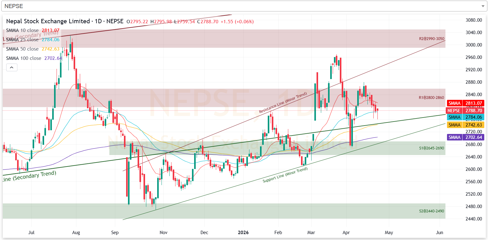 अघिल्लो साता प्रतिरोध परीक्षणमा रहेको नेप्से परिसूचक, गत साता प्रतिरोध तोड्न नसकेर झरेको छ। हाल नेप्सेको प्रतिरोध क्षेत्र २८०० देखि २८६० सम्म रहेको छ। आगामी दिनमा नेप्से ओरालो लागेमा २६४५ देखि २६९० को क्षेत्रमा टेवा पाउने देखिन्छ।