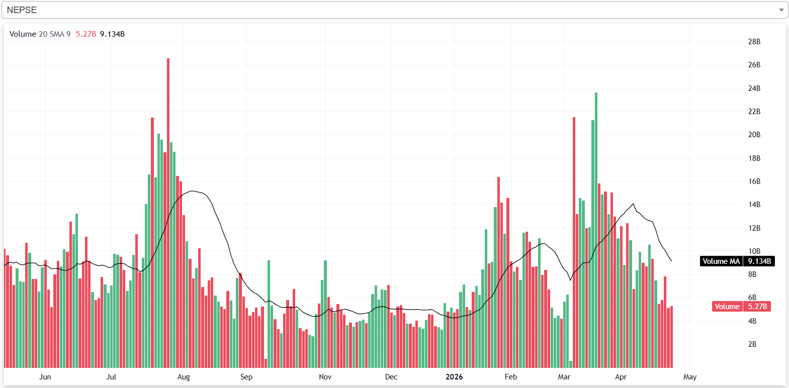 गत साता नेप्सेको भोल्यूम कमजोर रहेको छ। गत साता नेप्सेमा दैनिक औषतमा ५ अर्ब ८७ करोड रुपैयाँबराबरको शेयर खरिदबिक्री भएको छ। साताको अन्तिम कारोबार दिन नेप्सेको २० दिने औषत भोल्यूम ९ अर्ब १३ करोड रुपैयाँ रहेको छ। २० दिने औषत भोल्यूमको तुलनामा गत साताको दैनिक औषत भोल्यूम ३५.७० प्रतिशत कम हो।