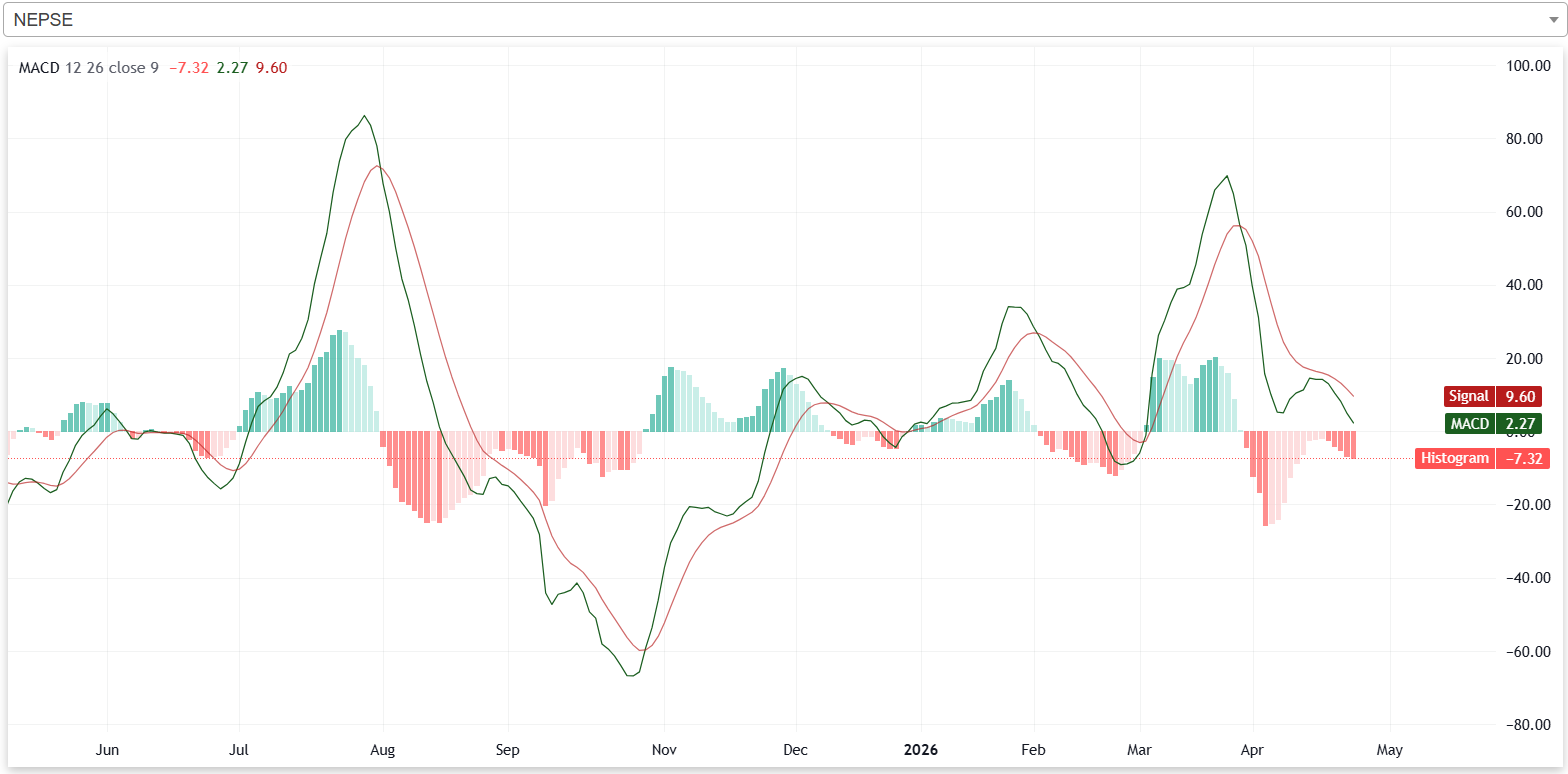 गत साता नेप्सेको एमएसिडी रेखा, सिग्नल रेखाभन्दा तल रहेको छ। त्यस्तै, नेप्सेको हिस्टोग्राम पनि नकारात्मक क्षेत्रमा रहेको छ। यसले गत साता बजारमा बुलिश मुभमेन्ट कमजोर रहेको संकेत गर्दछ।