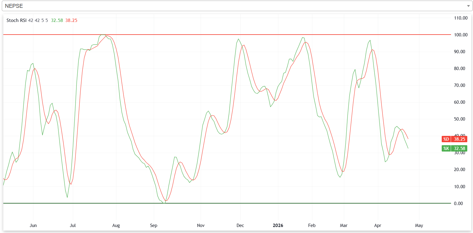 गत साता नेप्सेको स्टकास्टिक आरएसआई ओभरसोल्ड जोन नजिक रहेको छ। जब यो आरएसआई ओभरसोल्ड जोन नजिक पुग्छ, तब बजारमा एक ‘बाउन्स ब्याक’ आउने सम्भावना बढी हुन्छ।