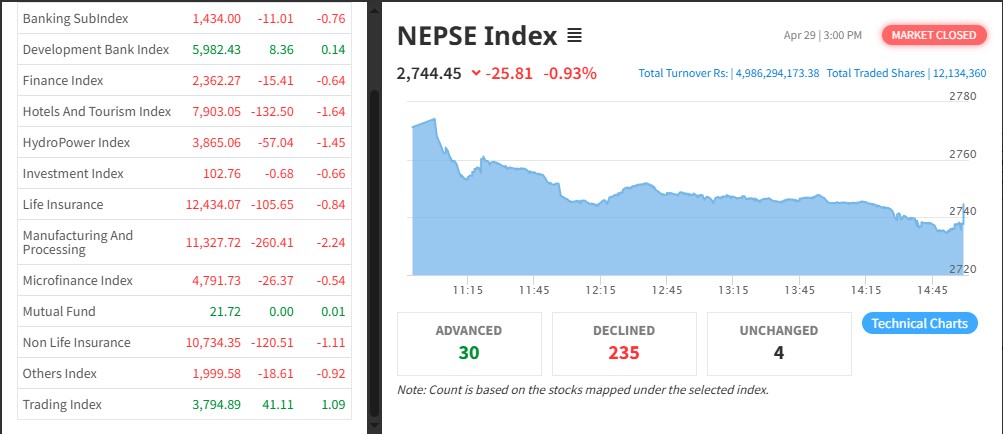 बुधबार नेप्से परिसूचक २५.८१ अंक घटेर २७४४.४५ विन्दुमा झरेको छ। त्यस्तै, यस दिन सेन्सेटिभ इण्डेक्स ३.०६ अंक घटेको छ भने फ्लोट इण्डेक्स १.७४ अंक र सेन्सेटिभ फ्लोट इण्डेक्स १.०९ अंक घटेको छ।