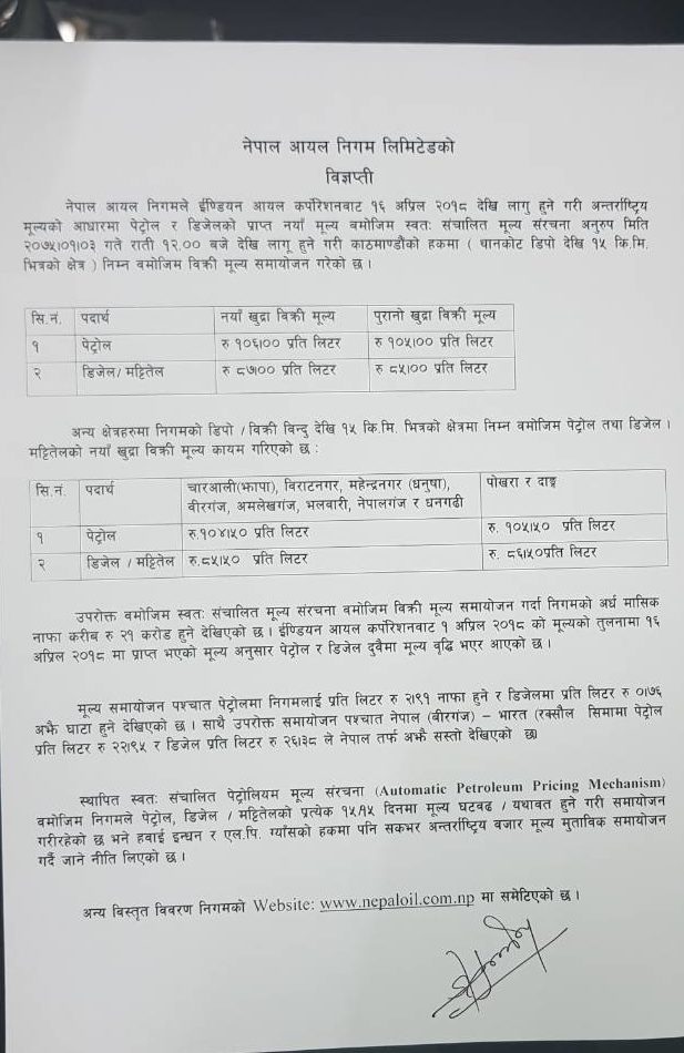 समायोजित नयाँ मूल्यअनुसार अब पेट्रोल प्रतिलिटर १०६ रुपैयाँ र डिजेल तथा मट्टितेल प्रतिलिटर ८७ रुपैयाँ कायम भएको छ । नयाँ मूल्य अनुसार पेट्रोलमा २ रूपैयाँ ९१ पैसा नाफा हुने र डिजेलमा शुन्य रूपैयाँ ७६ पैसा घाटा रहेको निगमले जनाएको छ ।