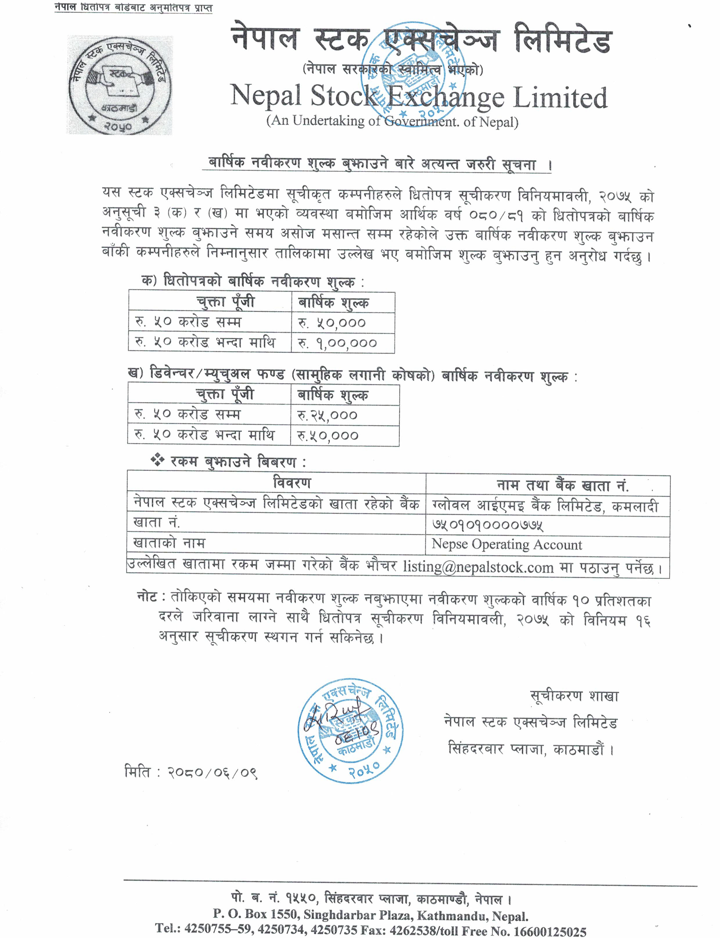 नेप्सेले धितोपत्र सूचीकरण विनियमावली, २०७५ को अनुसूची ३ क र खमा भएको व्यवस्था बमोजिम आर्थिक वर्ष ०८०/८१को धितोपत्रको वार्षिक नवीकरण शुल्क बुझाउने समय असोज मसान्तसम्म रहेको उल्लेख गरेकाे छ ।